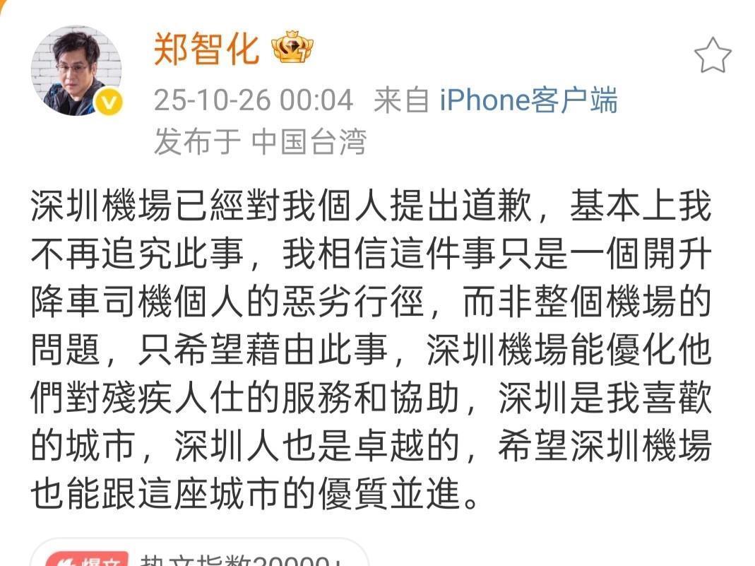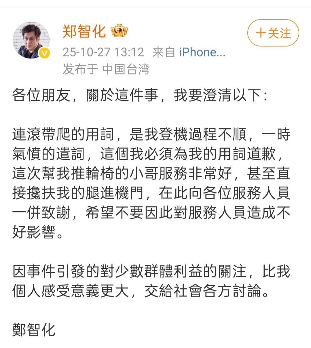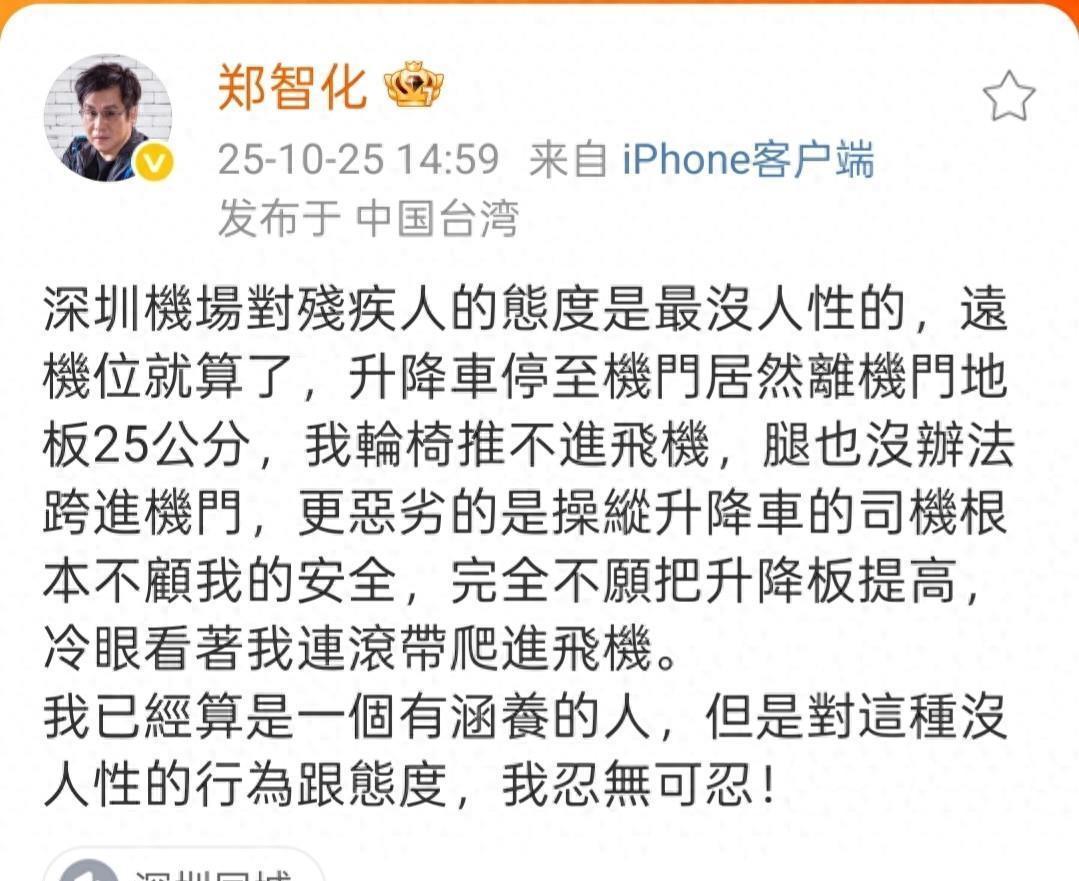 然而,近日这位昔日的时代歌者却因深圳机场的“登机风波”,被卷入了舆论的狂风巨浪之中。事件起因于郑智化公开批评在深圳机场登机时遭遇了“连滚带爬”的糟糕体验。此言一出,犹如一颗石子投入平静的湖面,瞬间激起了千层浪。深圳机场方面反应迅速,第一时间公开致歉,并承诺会改善相关服务,以提升乘客的出行体验。这一举措,在一定程度上安抚了公众的情绪,也让大家对机场的后续改进充满了期待。但剧情却在10月26日出现了戏剧性的反转。当天,登机监控片段曝光,画面中的场景与郑智化所描述的“连滚带爬”似乎存在较大出入。这一情况立刻引发了网友们的广泛质疑,大家纷纷认为郑智化的表述过于夸张,有博眼球之嫌。深圳机场也迅速做出回应,表示将核实视频流出情况,以还原事件的真相。一时间,舆论的风向瞬间逆转,郑智化从原本的“受害者”形象,陷入了“失言”的争议漩涡之中。